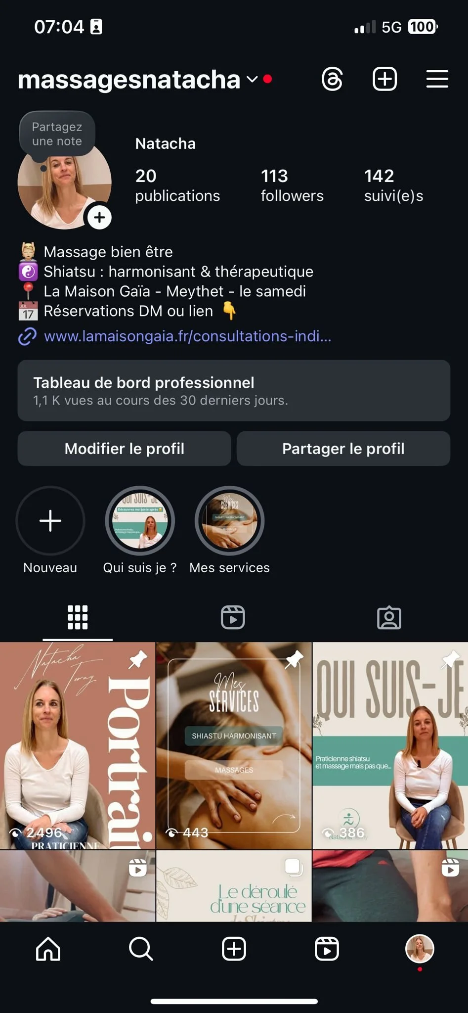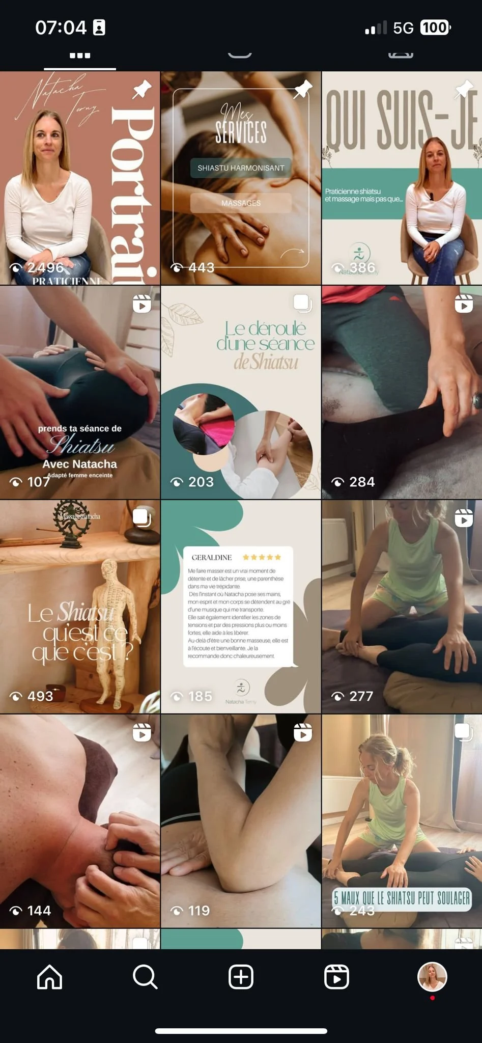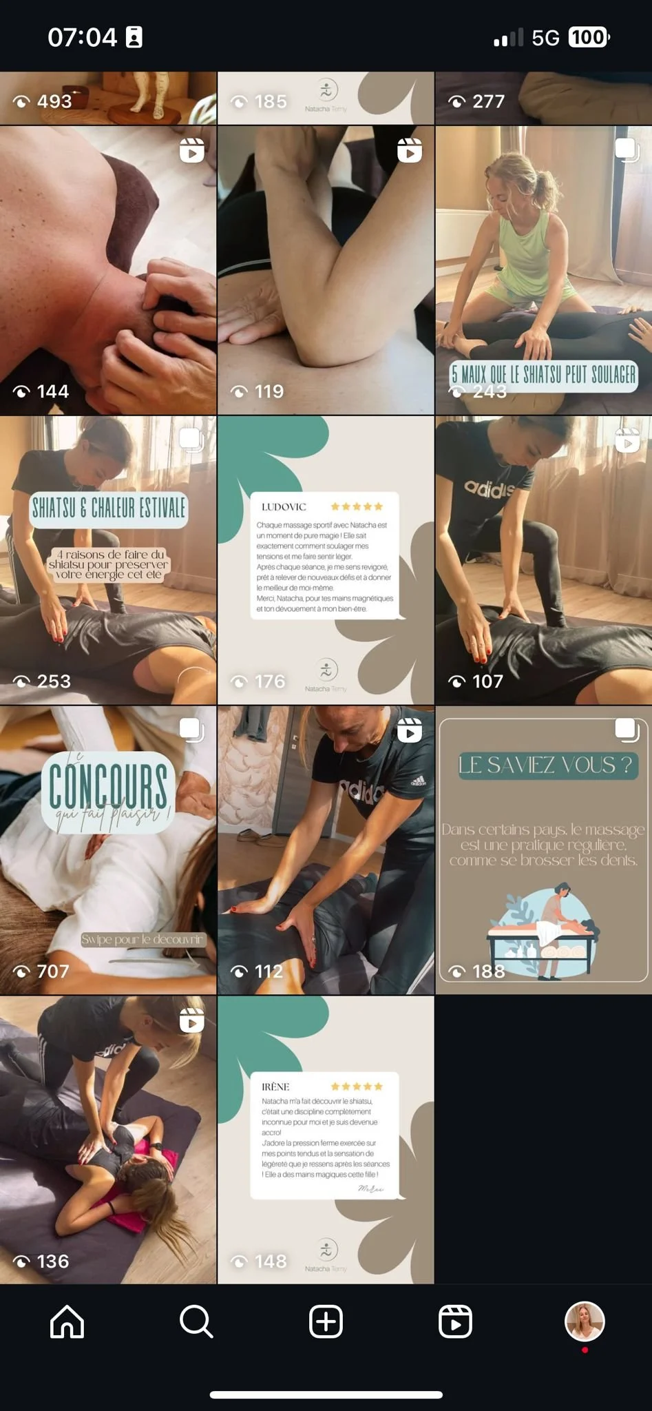 Animation du réseaux social Instagram : stratégie de communication, planning édito, prise de photos / vidéos de Natacha en cours de pratique pour création des posts et montage de réels, programmation pour publication.